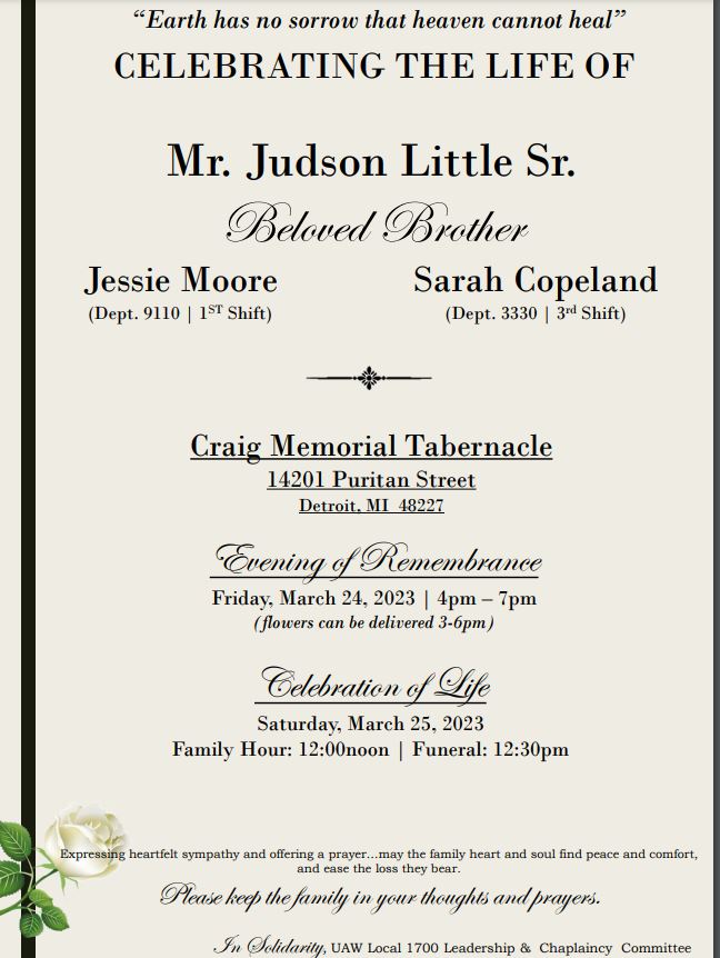 CELEBRATING THE LIFE OF MR JUDSON LITTLE SR BELOVED BROTHER OF JESSIE MOORE DEPT 9110 AND SARAH COPELAND DEPT 3330