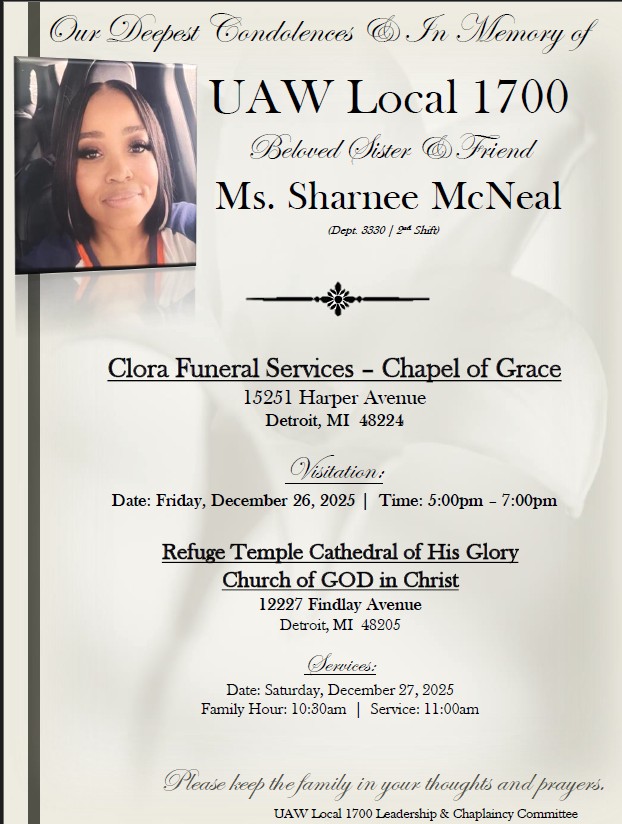 IN MEMORY OF UAW LOCAL 1700 SISTER & FRIEND MS SHARNEE MCNEAL 3330 2ND SHIFT