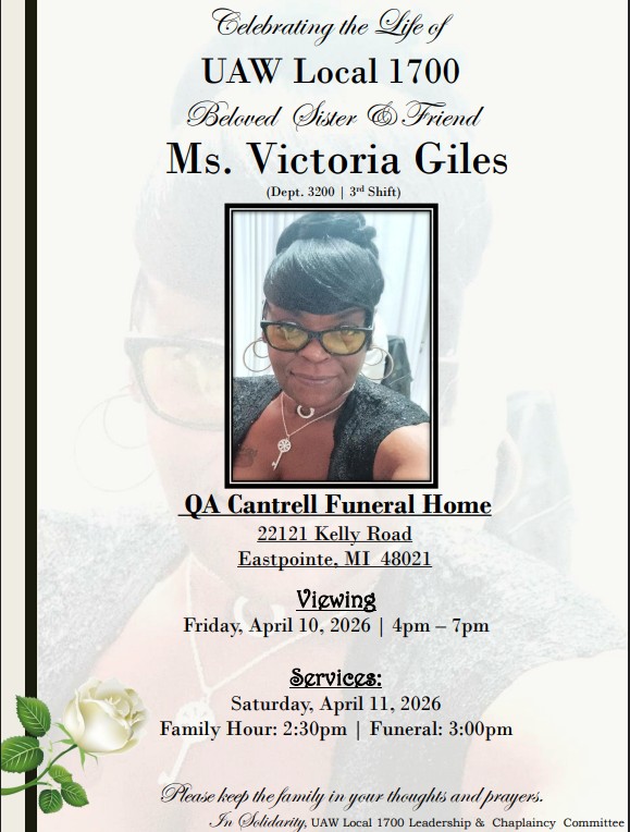 CELEBRATING THE LIFE OF UAW LOCAL 1700 SISTER & FRIEND MS VICTORIA GILES DEPT 3200 3RD SHIFT