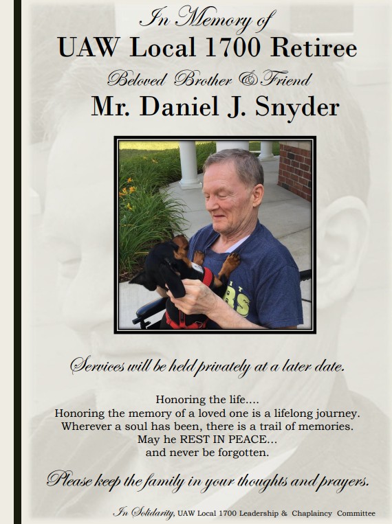 IN MEMORY OF UAW LOCAL 1700 BROTHER & FRIEND RETIREE MR DANIEL SNYDER