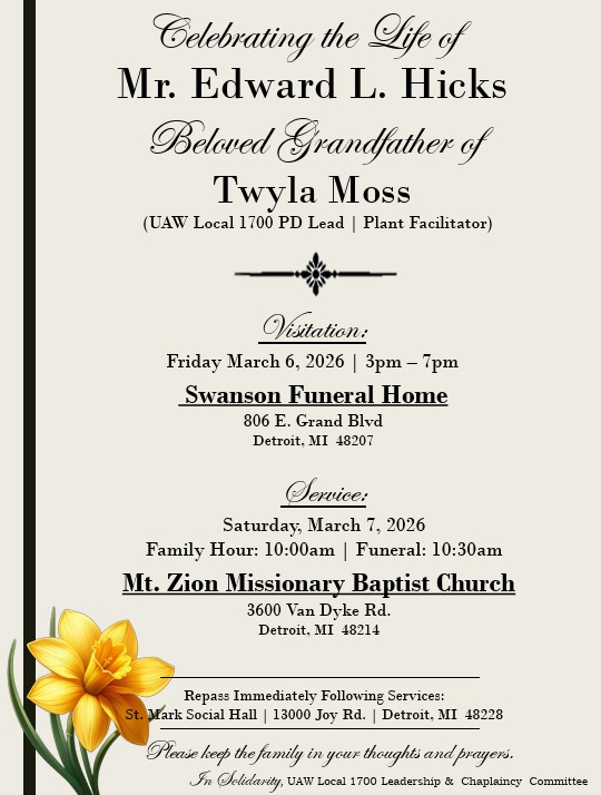 CELEBRATING THE LIFE OF MR EDWARD LEVI HICKS BELOVED GRANDFATHER OF TWYLA MOSS UAW LOCAL 1700 PD LEAD