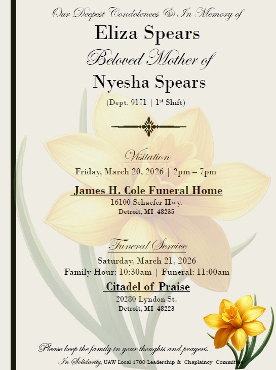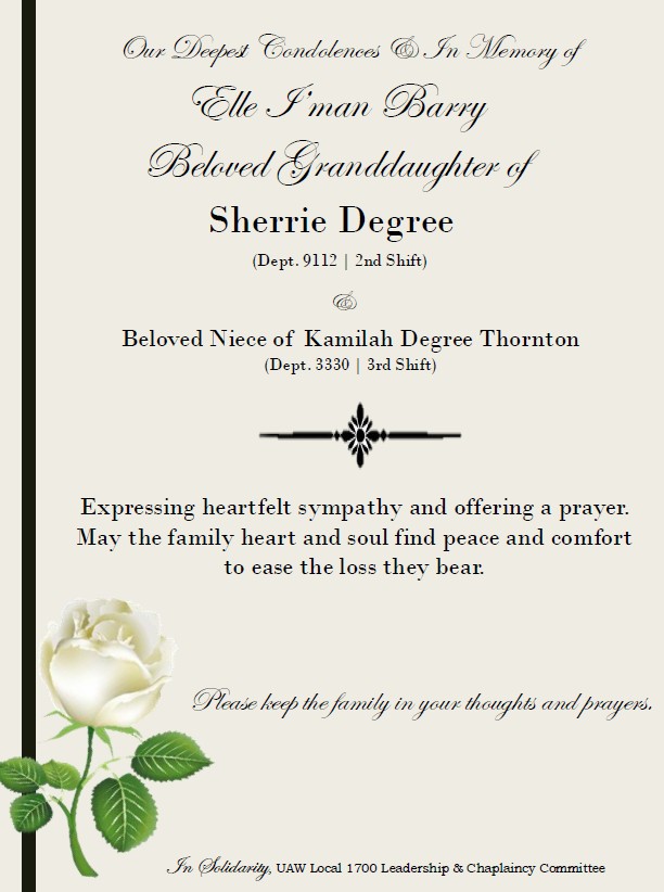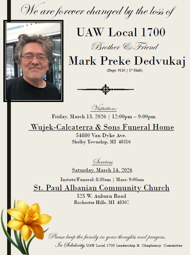 WE ARE FOREVER CHANGED BY THE LOSS OF UAW LOCAL 1700 BROTHER & FRIEND MARK DEDVUKAJ DEPT 9110 1ST SHIFT (1)