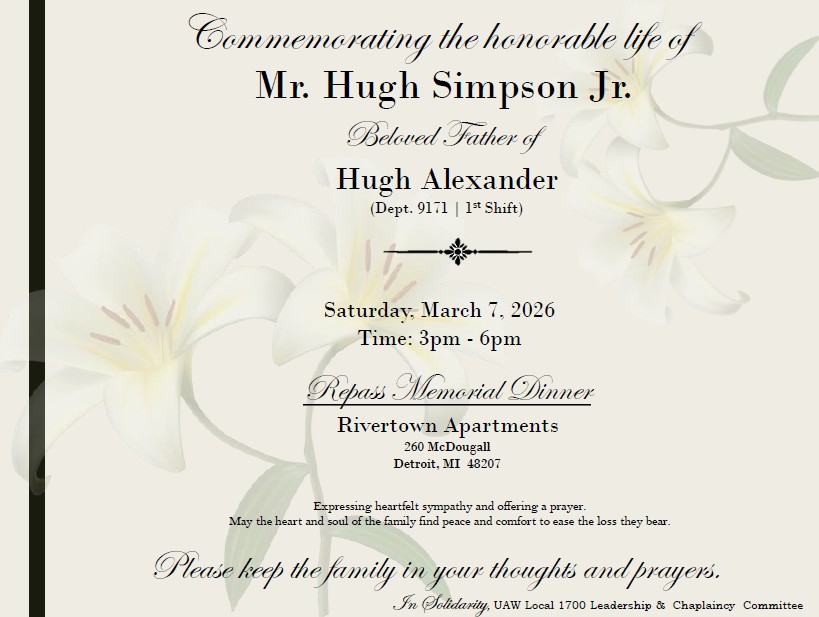 COMMEMORATING THE HONORABLE LIFE OF MR HUGH SIMPSON JR BELOVED FATHER OF HUGH ALEXANDER DEPT 9171 1ST SHIFT 1ST SHIFT (1)