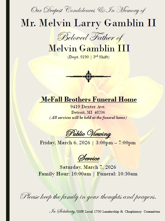 IN MEMORY OF MR MELVIN L. GAMBLIN II BELOVED FATHER OF MELVIN GAMBLIN III DEPT 9190 3RD SHIFT - PLEASE KEEP THE FAMILY IN YOUR THOUGHTS & PRAYERS