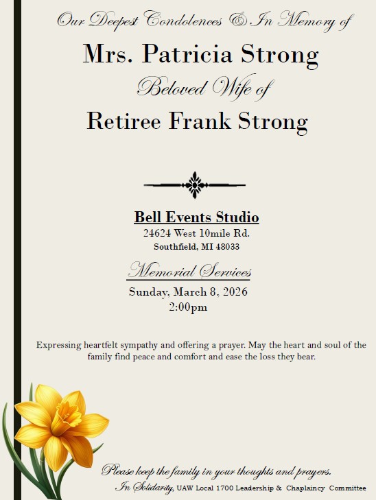 In Memory of Patricia Strong Beloved Wife of Retiree Frank Strong