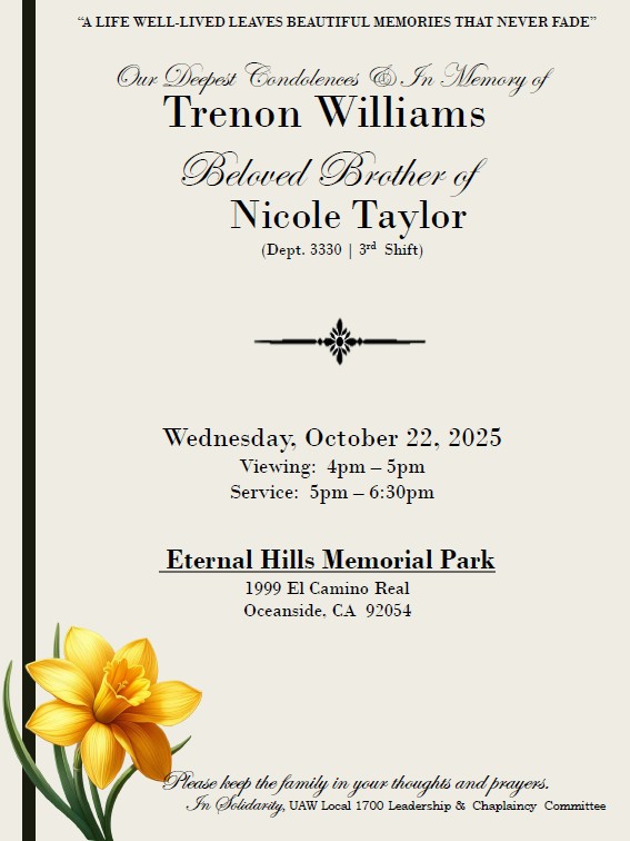 IN LOVING MEMORY OF TRENON WILLIAMS BELOVED BROTHER OF NICOLE TAYLOR DEPT 3330 3RD SHIFT - PLEASE KEEP THE FAMILY IN YOUR THOUGHTS & PRAYERS