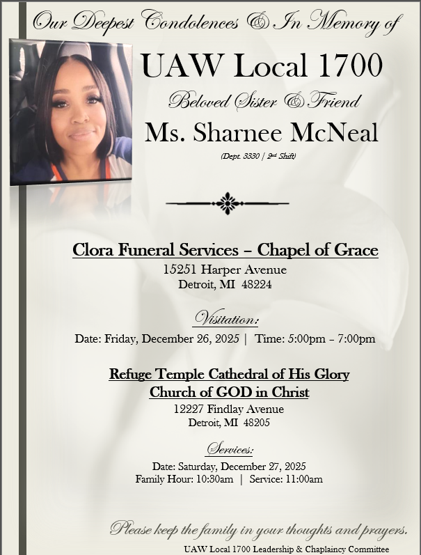 IN MEMORY OF UAW LOCAL 1700 SISTER & FRIEND MS SHARNEE MCNEAL 3330 2ND SHIFT