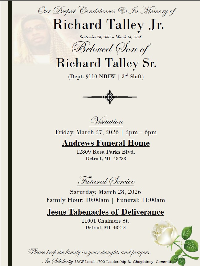 OUR DEEPEST CONDOLENCES & IN MEMORY OF BELOVED SON OF RICHARD TALLEY DEPT 9110 NBIW 3RD SHIFT
